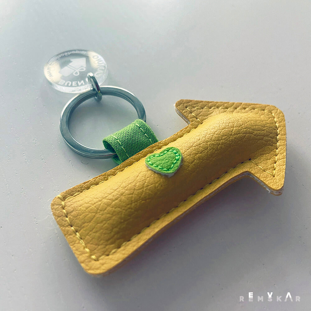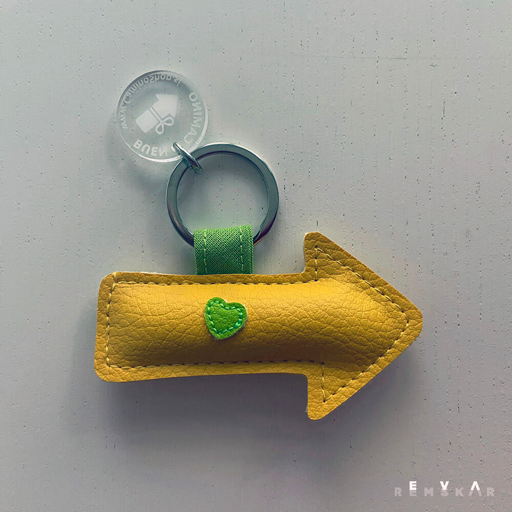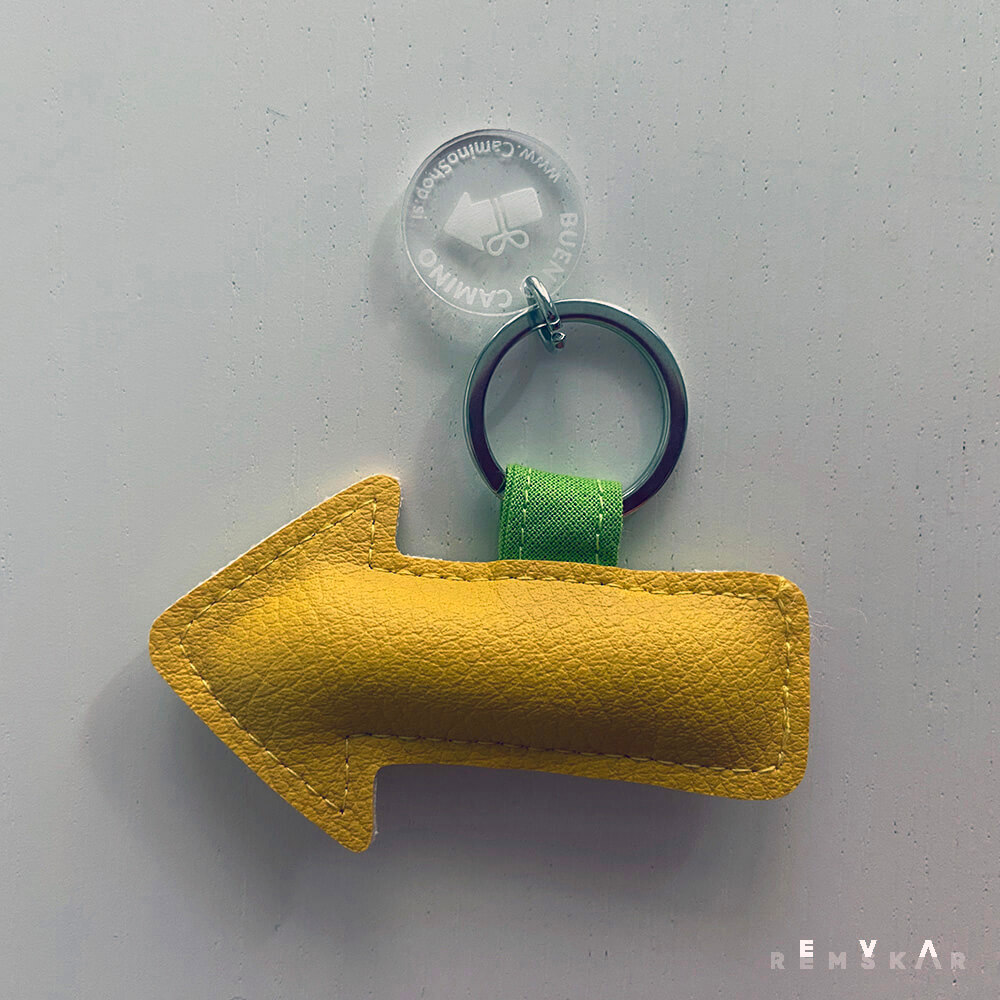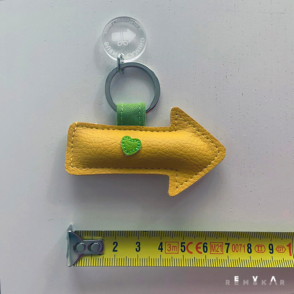 Sem usnjen obesek za ključe v obliki rumene puščice. Moja oblika in barva simbolizirata pripadnost romarstvu, saj kdor camino doživi, ga vedno nosi v srcu. Rumena barva simbolizira sončno svetlobo, ki spremlja naše korake na poti, puščica pa pomeni premike v naravi in v glavi.